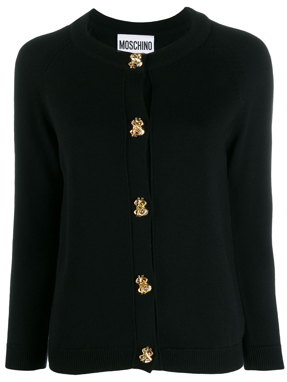 classic knitted cardigan The Moschino vision is all about a confident attitude and a mash-up of playful references infused with street style appeal. This black wool classic knitted cardigan from Moschino features a round neck, a front button fastening, long sleeves and gold-tone hardware. Made in Italy Composition Virgin Wool 100% SIZE & FIT Model measurements Height 5 ft 10 in(1.77 m) Bust/Chest 34.25 in(87 cm) Hips 38.58 in(98 cm) Waist 26.37 in(67 cm) FittingInformation This piece fits true to size. We recommend you get your regular size Cut for a relaxed fit Made with a mid-weight fabric Washing instructions Hand Wash