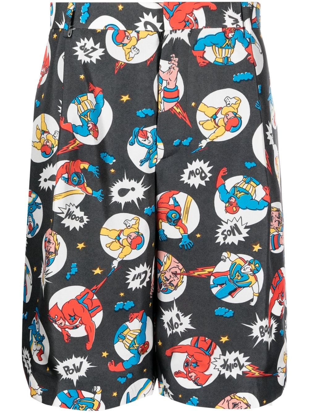 comic-print silk shorts Highlights - Dark grey/multicolour - Silk - All-over graphic print - Pleat detailing - Belt loops - Concealed front fastening - Two side inset pockets - Two rear jetted pockets - Knee-length Made in Italy Composition Lining: Acetate 60%, Cupro 40% Outer: Silk 100% SIZE & FIT Model measurements Height 6 ft 2 in(1.87 m) Bust/Chest 36.41 in(92.5 cm) Hips 37 in(94 cm) Waist 29.52 in(75 cm) FittingInformation Designed for relaxed fit, offering a comfortable loose fit over the leg The elasticated waist allows for a comfortable fit Made from a lightweight non-stretch fabric This piece fits true to size – take your usual size Washing instructions Dry Clean Only