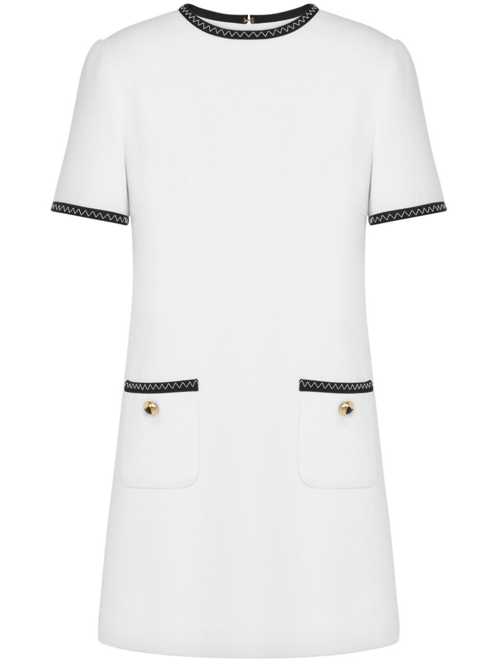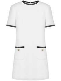 contrasting-trim mini dress Highlights - White - Knitted construction - Contrasting trim - Decorative stitching - Gold-tone buttons - Round neck - Rear hook and eye fastening - Short sleeves - Two front patch pockets - Straight hem - Thigh-length Made in Italy Composition Viscose 58%, Virgin Wool 40%, Elastane 2% Washing instructions Read Manufacturer Guidelines