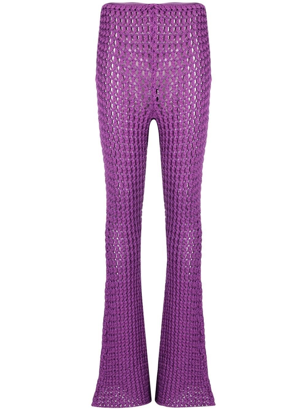 crochet-knit flared trousers purple cotton crochet knit flared design high-waisted floor-length Made in Italy Composition Cotton 100%, Viscose 75%, Polyamide 25% SIZE & FIT Model measurements Height 5 ft 10 in(1.77 m) Bust/Chest 29.92 in(76 cm) Hips 34.25 in(87 cm) Waist 23.62 in(60 cm) FittingInformation This piece fits true to size. We recommend you get your regular size Cut for a close fit Made with a mid-weight fabric Washing instructions Dry Clean Only