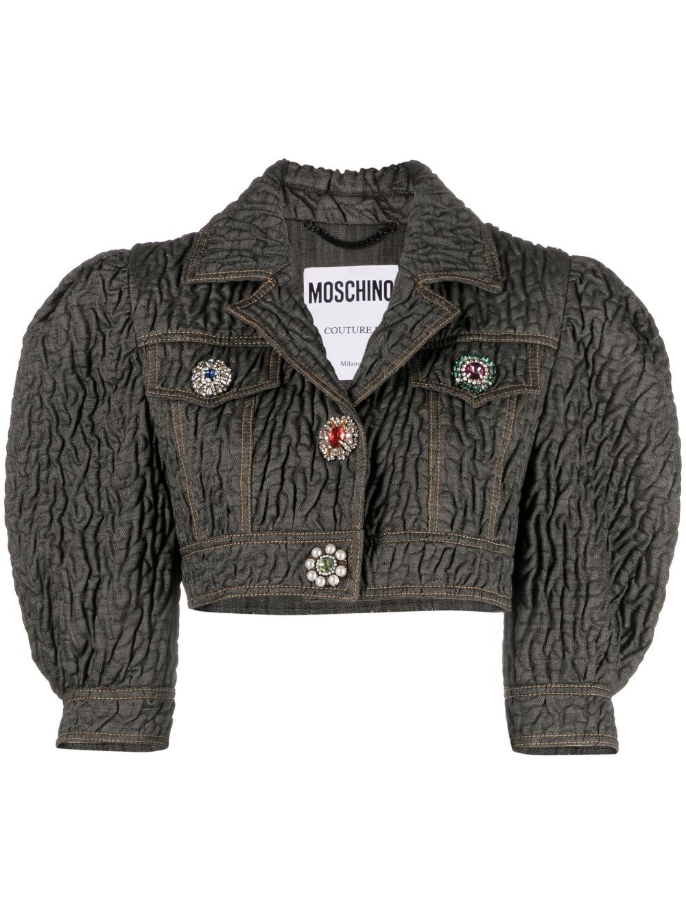 crystal-embellished butted cropped jacket Highlights - Black - Stretch-cotton - Textured finish - Crystal-embellished buttons - Notched collar - Short puff sleeves - Buttoned cuffs - Front button fastening - Two button-fastening chest pockets - Cropped Made in Italy Composition Outer: Cotton 61%, Polyester 33%, Elastane 6% Lining: Cotton 98%, Spandex/Elastane 2% SIZE & FIT Model measurements Height 5 ft 10 in(1.77 m) Bust/Chest 31.49 in(80 cm) Hips 35.03 in(89 cm) Waist 23.22 in(59 cm) FittingInformation Designed for a slim fit that sits just away from the body offering a close yet comfortable fit Cropped in length Constructed from stretch denim, this piece offers a stretch fit with durability This piece fits true to size – take your usual size Washing instructions Hand Wash