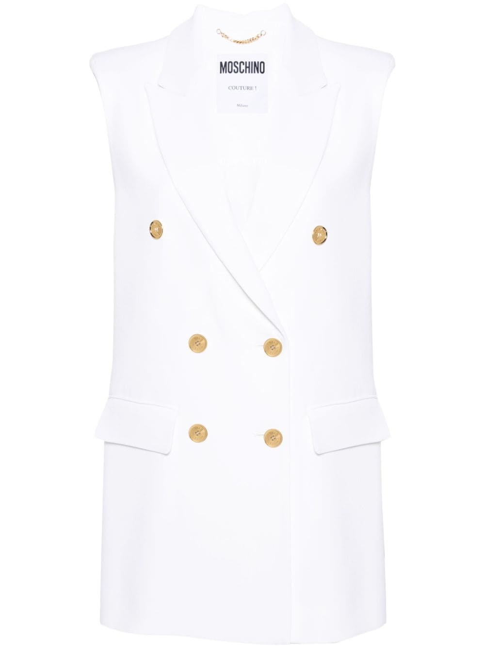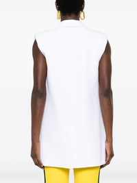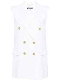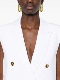 double-breasted blazer gilet Highlights - White - Crepe texture - Peak lapels - Shoulder pads - Sleeveless - Faux pocket detail - American rear vent - Partial lining - Straight hem - Gold-tone buttons - Double-breasted button fastening Made in Italy Composition Outer: Viscose 97%, Elastane 3% Lining: Acetate 83%, Silk 17% SIZE & FIT Model measurements Height 5 ft 10 in(1.77 m) Bust/Chest 32.28 in(82 cm) Hips 35.03 in(89 cm) Waist 25.19 in(64 cm) FittingInformation Designed to be unstructured, offering a loose fit throughout The internal shoulder pads offer a structured shape Made from a midweight fabric This piece fits true to size – take your usual size Washing instructions Dry Clean Only