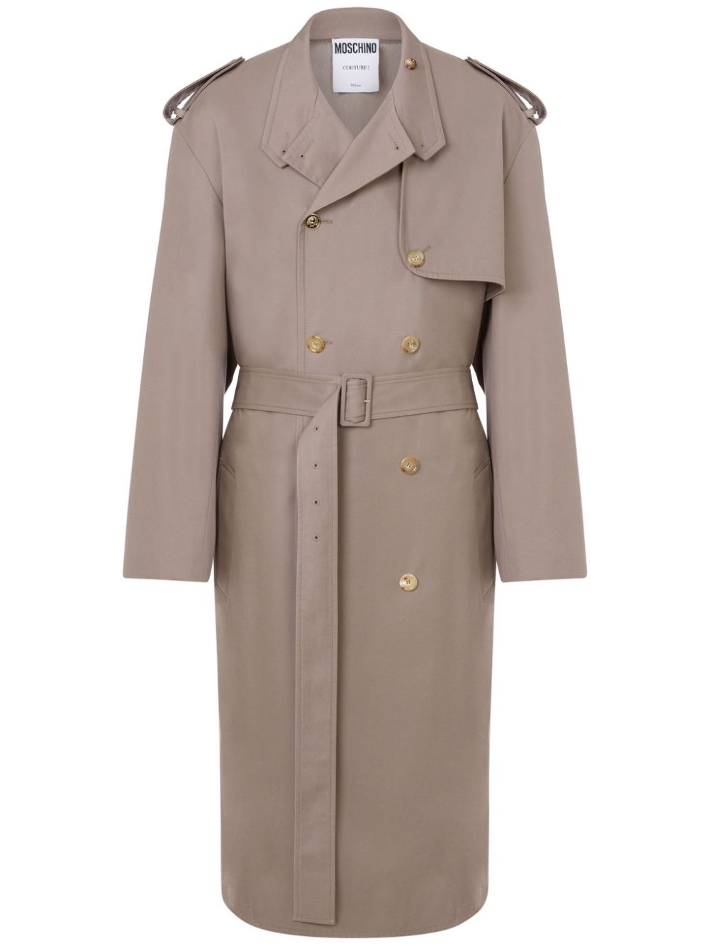 double-breasted trench coat Highlights - Blush beige - Textured finish - Double-breasted button fastening - Belted waist - Spread collar - Epaulettes - Long sleeves - Two side welt pockets - Storm flap - Straight hem - Mid-length Made in Italy Composition Polyester 65%, Cotton 35%