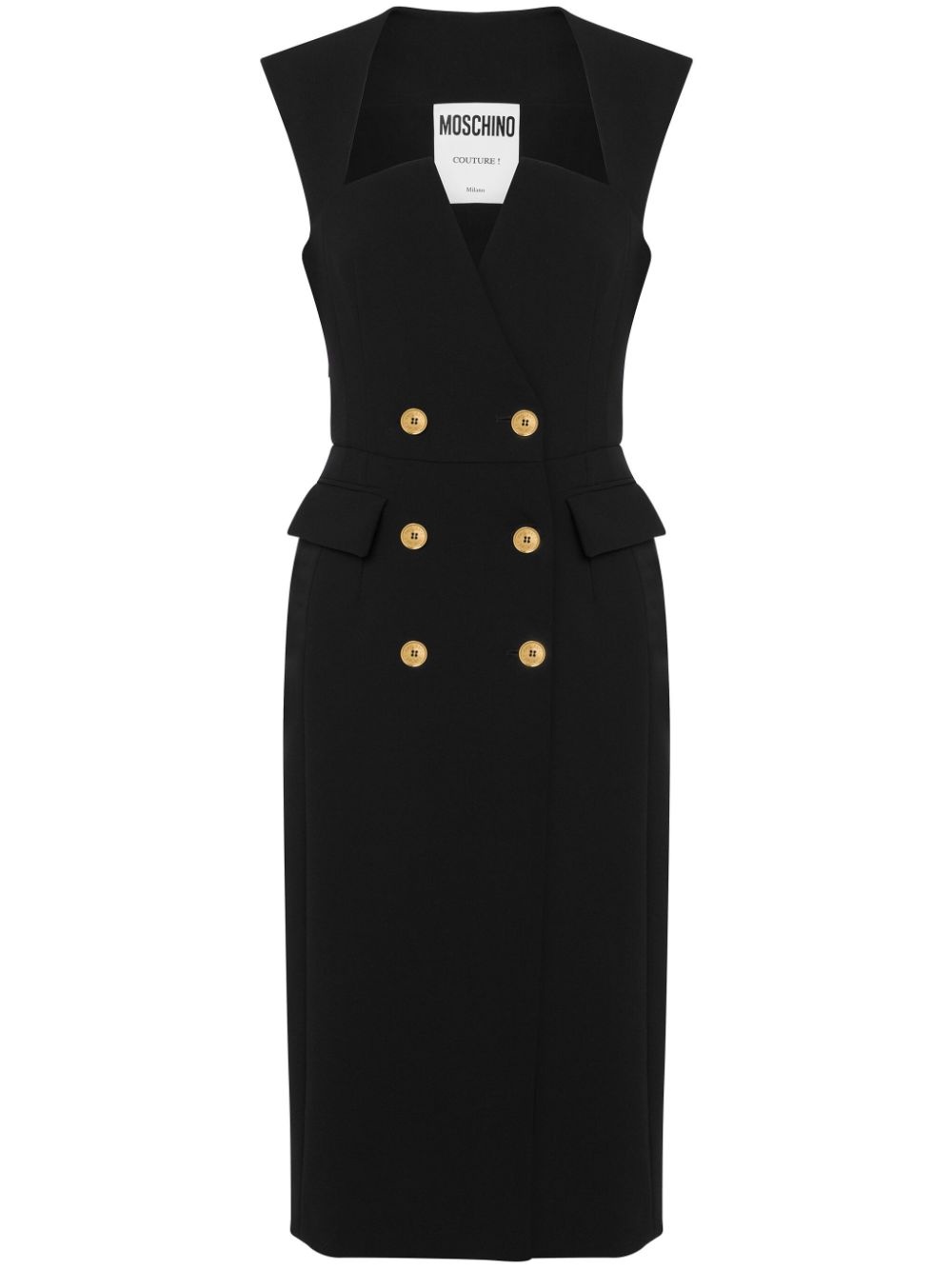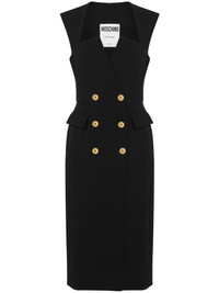 double-breasted midi dress Highlights - Jet black - Wrap design - Gold-tone buttons - Square neck - Double-breasted button fastening - Wide shoulder straps - Sleeveless - Fitted waistline - Two front flap pockets - Straight hem - Below-knee length Made in Italy Composition Polyester 88%, Elastane 12% SIZE & FIT FittingInformation Designed for a slim fit that sits just away from the body offering a close yet comfortable fit The dart stitching adds structure and a closer fit in the torso of this piece Made from a midweight fabric