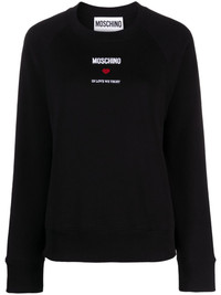 embroidered-logo cotton sweatshirt Moschino's penchant for playful motifs is evidenced by this cotton sweatshirt. It arrives in a jet-black hue and plays host to an embroidered heart motif alongside logo lettering and a slogan that reads, "IN LOVE WE TRUST". Highlights - Black - Cotton - Jersey texture - Embroidered logo and slogan to the front - Heart motif embroidery - Round neck - Long raglan sleeves - Ribbed cuffs and hem - Short side zip fastening slits - French terry lining - Straight hem Imported Composition Cotton 100% SIZE & FIT Model measurements Height 5 ft 11 in(1.8 m) Bust/Chest 34.25 in(87 cm) Hips 35.82 in(91 cm) Waist 24.8 in(63 cm) FittingInformation Designed for a relaxed fit, this piece allows for comfort and movement when worn Made from a midweight non-stretch fabric, this piece offers minimal elasticity when worn This piece fits true to size – take your usual size