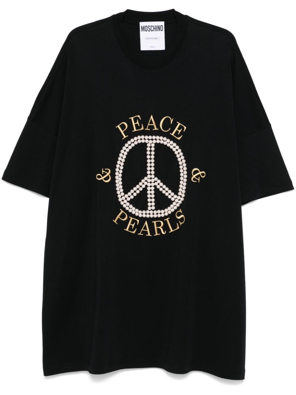 faux-pearl detail mini dress Highlights - Black - Cotton - Jersey texture - Ribbed crew neck - Drop shoulder - Short sleeves - Peace sign motif - Faux-pearl detailing - Straight hem Imported Composition Polyester 100%, Cotton 100% SIZE & FIT Model measurements Height 5 ft 11 in(1.8 m) Bust/Chest 31.49 in(80 cm) Hips 36.61 in(93 cm) Waist 24.4 in(62 cm) FittingInformation Designed to be unstructured, offering a loose fit throughout Made from a midweight non-stretch fabric, this piece offers minimal elasticity when worn