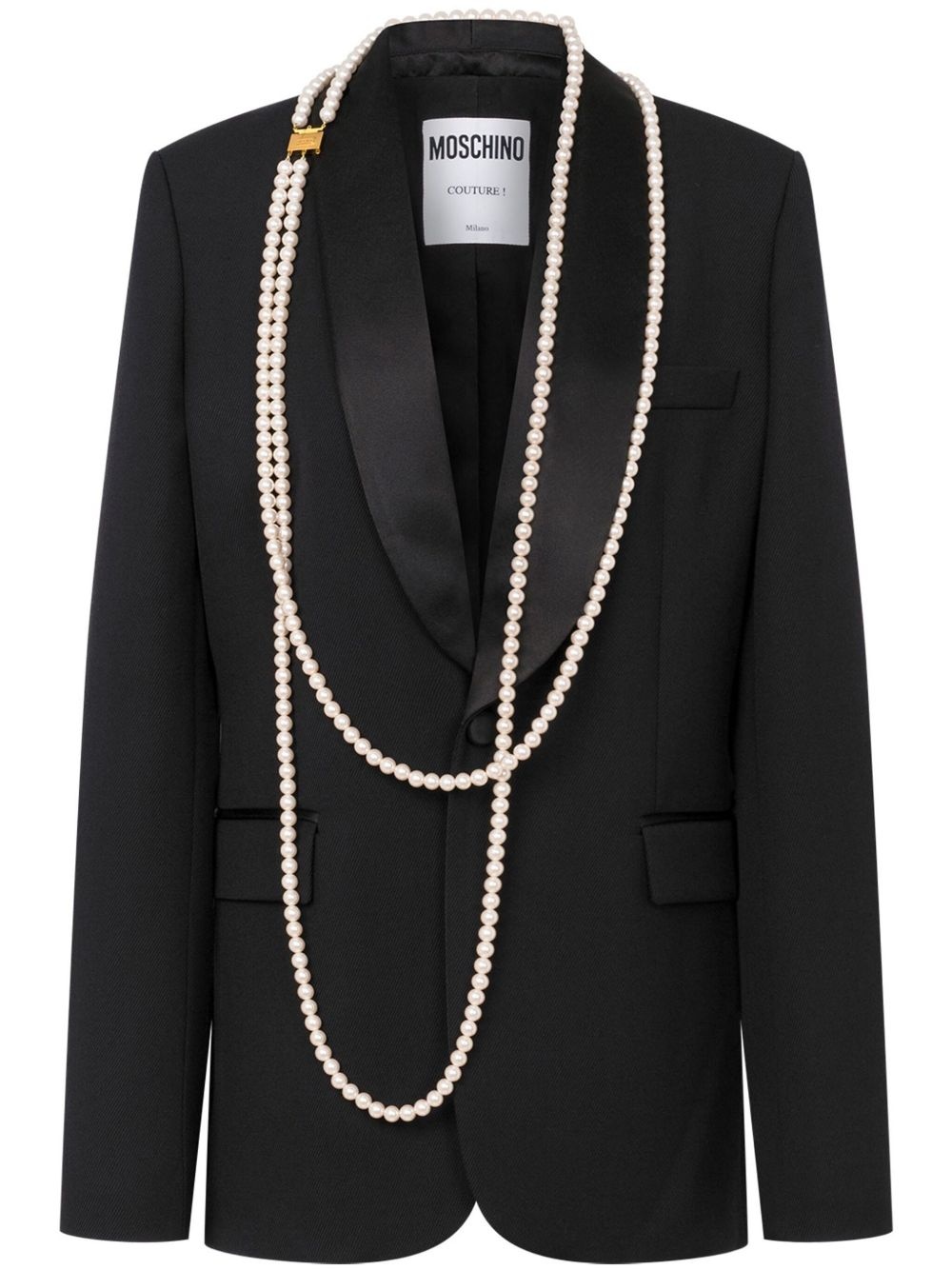 faux-pearl-embellished blazer Highlights - Black - Front button fastening - Two side flap pockets - Buttoned cuffs - Central rear vent Made in Italy Composition Fabric 55%, Polyester 39%, Polyamide 6%