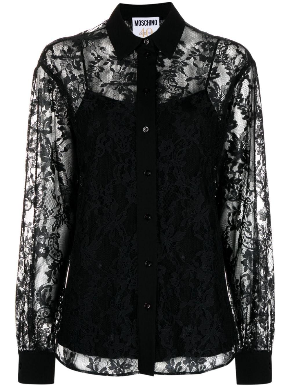floral-lace button-up shirt Moschino infuses a sense of romance into this black shirt: it's cut from a semi-sheer floral lace fabric that reveals a hint of skin underneath. Highlights - Black - Floral-lace detailing - Classic collar - Front button fastening - Long sleeves - Buttoned cuffs - Curved hem - Detachable slip tank top Made in Italy Composition Polyamide 100% Lining: Acetate 83%, Silk 17% Outer: Silk 100% SIZE & FIT Model measurements Height 5 ft 11 in(1.8 m) Bust/Chest 33.07 in(84 cm) Hips 37 in(94 cm) Waist 25.59 in(65 cm) FittingInformation Designed for a relaxed fit, this piece allows for comfort and movement when worn The detachable slip sits just away from the body, offering a close yet comfortable fit Made from a lightweight fabric This piece fits true to size – take your usual size