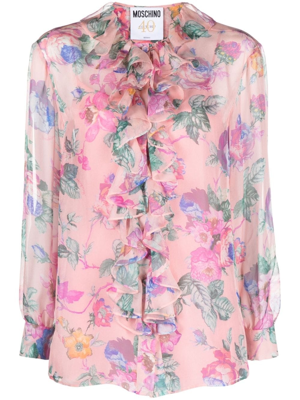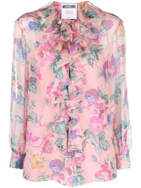 floral-print ruffled blouse Moschino infuses a sense of romance into this pink blouse: it's cut from a silk chiffon crepe awash with a floral print and trimmed with cascading ruffles on the front. Highlights - Rose pink/multicolour - Silk - Chiffon crepe - All-over floral print - Ruffled detailing - Round neck - Front button fastening - Long puff sleeves - Buttoned cuffs - Straight hem - Detachable georgette slip tank top Made in Italy Composition Outer: Silk 100% Lining: Acetate 73%, Silk 27% SIZE & FIT Model measurements Height 5 ft 11 in(1.8 m) Bust/Chest 33.07 in(84 cm) Hips 37 in(94 cm) Waist 25.59 in(65 cm)