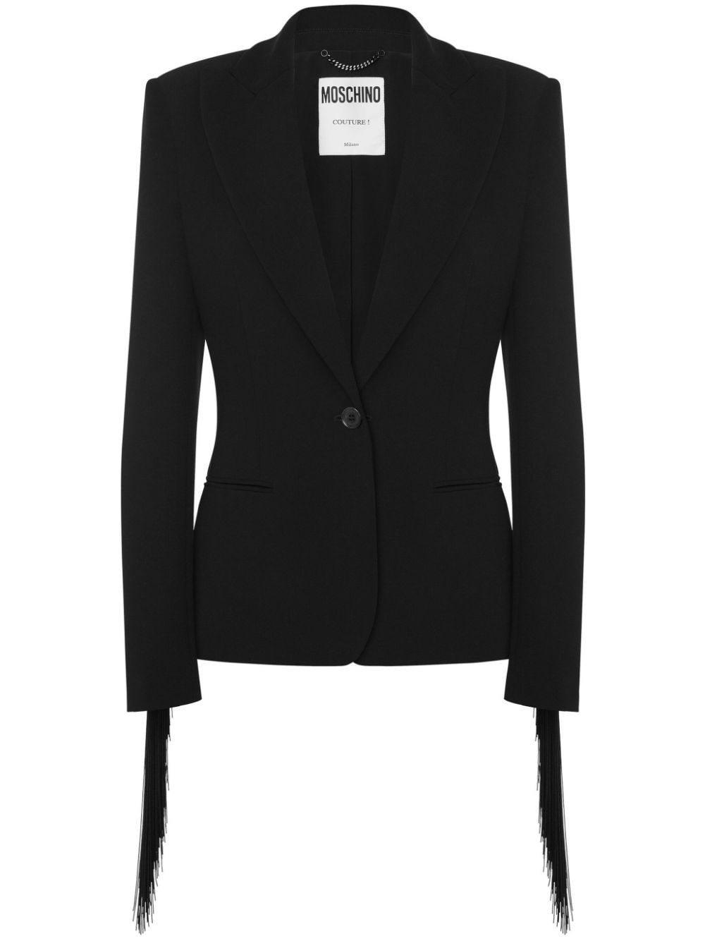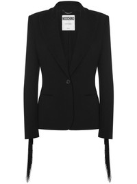 fringed single-breasted blazer Highlights - Black - Crepe texture - Fringe detailing - Shoulder pads - Long sleeves - Notched lapels - Front button fastening Made in Italy Composition Polyester 88%, Elastane 12%