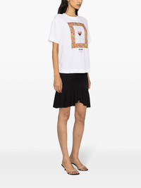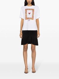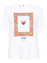 graphic-print crepe blouse Moschino elevates the classic white T-shirt with its playful style. It's spun in Italy from a stretch-cotton jersey to a crew neck and shorts sleeves, while a multicoloured crochet knit print on the front brings the design to life. Highlights - White/multicolour - Stretch-cotton - Crepe texture - Graphic print to the front - Logo print to the front - Gold-tone hardware - Crew neck - Short rear zip fastening - Short sleeves - Straight hem Made in Italy Composition Cotton 94%, Spandex/Elastane 6% SIZE & FIT Model measurements Height 5 ft 10 in(1.78 m) Bust/Chest 31.49 in(80 cm) Hips 35.03 in(89 cm) Waist 23.62 in(60 cm) FittingInformation Designed for a relaxed fit, this piece allows for comfort and movement when worn Made from a midweight non-stretch fabric This piece fits true to size – take your usual size