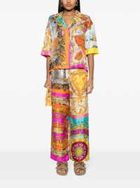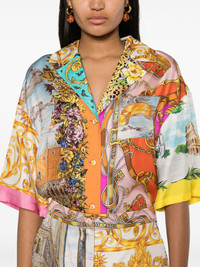 graphic-print silk shirt Busy patterns, playful motifs and vibrant colours are the core of Moschino's DNA. This silk shirt embodies just that: the short-sleeved design is covered with floral, architectural and baroque-inspired prints that lend a whimsical finish. Highlights - Multicolour - Silk - Satin weave - Graffiti print - Notched collar - Front button fastening - Fabric-covered buttons - Short sleeves - Straight hem Made in Italy Composition Outer: Silk 100% Lining: Acetate 60%, Cupro 40% SIZE & FIT Model measurements Height 5 ft 11 in(1.8 m) Bust/Chest 30.7 in(78 cm) Hips 35.03 in(89 cm) Waist 24.4 in(62 cm) FittingInformation Designed for a boxy fit, intended for a loose fit throughout Made from a lightweight non-stretch fabric This piece fits true to size – take your usual size Washing instructions Dry Clean Only