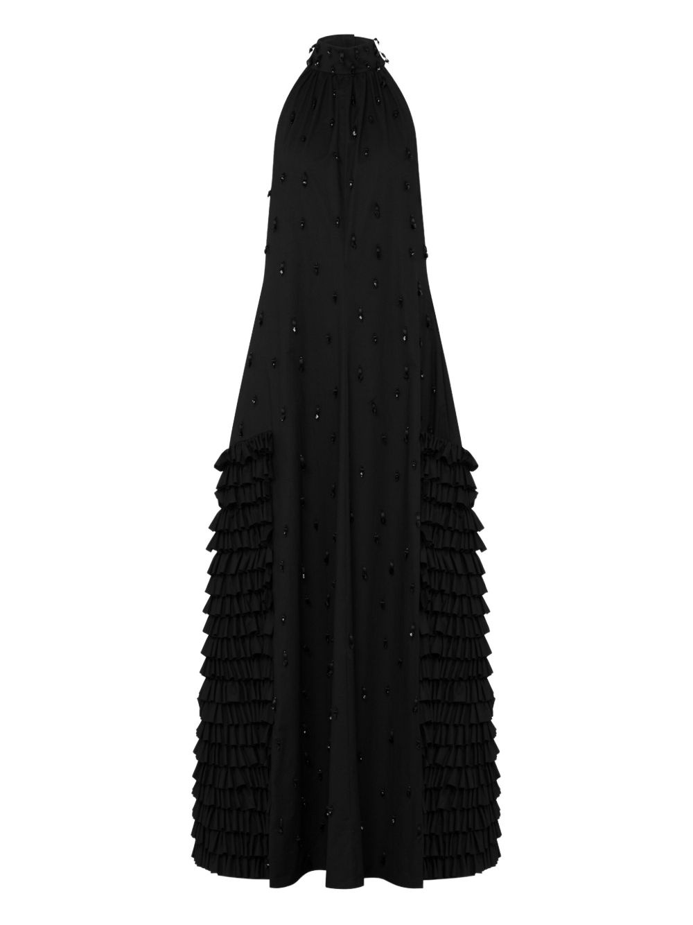 halterneck ruffled maxi dress Highlights - Black - Halterneck design - Open back - Cascading ruffle detailing - Tie fastening at the neck - Floor-length silhouette Made in Italy Composition Outer: Cotton 94%, Elastane 6% Lining: Cellulose Acetate 60%, Cupro 40% Washing instructions Dry Clean Only