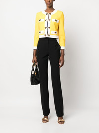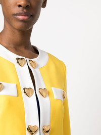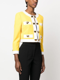 heart-applique cropped jacket Moschino imbues a classic silhouette with its signature playful touch in this cropped jacket. This yellow and white design is adorned with gold-tone heart shaped buttons, an ongoing motif that permeates the brand's SS23 collection. Highlights - Lemon yellow/white - Heart applique detailing - Gold-tone hardware - Contrasting border - Round neck - Concealed front fastening - Long sleeves - Buttoned cuffs - Straight hem - Cropped Made in Italy Composition Outer: Polyester 89%, Elastane 11% Lining: Acetate 83%, Silk 17% SIZE & FIT Model measurements Height 5 ft 10 in(1.77 m) Bust/Chest 29.92 in(76 cm) Hips 34.25 in(87 cm) Waist 23.62 in(60 cm) FittingInformation Designed for a relaxed fit, this piece allows for comfort and movement when worn The internal shoulder pads offer a structured shape Made from a midweight stretch fabric, this piece offers elasticity and flexibility when worn This piece fits true to size – take your usual size Washing instructions Dry Clean Only