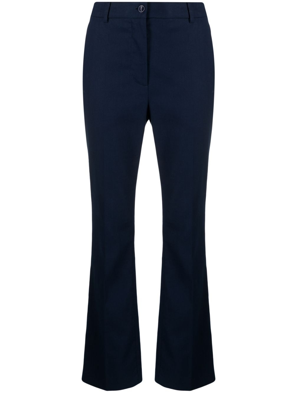 high-rise flared trousers These high-rise Boutique Moschino trousers showcase a flared silhouette with pressed crease. Created in a dark blue stretch cotton, the understated design is produced in a tonal construction, deviating away from the heavily patterned aesthetic typically associated with the brand. Imported Composition Lining: Acetate 60%, Cupro 40% Outer: Cotton 98%, Spandex/Elastane 2% SIZE & FIT Model measurements Height 5 ft 9 in(1.76 m) Bust/Chest 31.88 in(81 cm) Hips 35.43 in(90 cm) Waist 24.8 in(63 cm) FittingInformation This piece fits true to size. We recommend you get your regular size Designed to be fitted at the waist and through the thigh, loose from the knee Made with a mid-weight stretch fabric Washing instructions Dry Clean Only