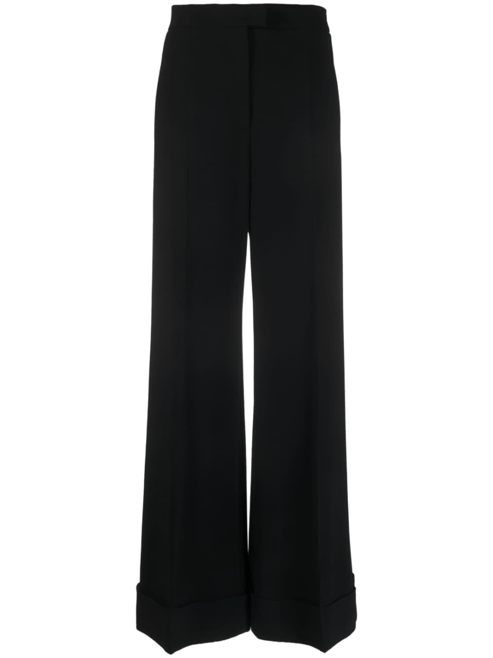 high-waisted wide-leg trousers Highlights - Black - High waist - Wide leg - Crease effect - Concealed front fastening - Two rear welt pockets - Turn-up hem Made in Italy Composition Lining: Acetate 60%, Cupro 40% Outer: Viscose 97%, Spandex/Elastane 3% SIZE & FIT Model measurements Height 5 ft 11 in(1.8 m) Bust/Chest 31.49 in(80 cm) Hips 35.82 in(91 cm) Waist 24.8 in(63 cm) Washing instructions Dry Clean Only