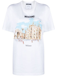 illustration-print organic cotton T-shirt Moschino pays homage to its home town with this white T-shirt. It is cut from organic cotton and plays host to an illustration-style print depicting the Duomo di Milano cathedral. Highlights - White/multicolour - Organic cotton - Soft jersey - Logo print to the front - Illustration-style print - Crew neck - Short sleeves - Straight hem Imported Composition Organic Cotton 100% SIZE & FIT Measurement SLEEVE LENGTH 7.87 in(20 cm) LENGTH 27.16 in(69 cm) BUST 41.73 in(106 cm) Washing instructions Hand Wash