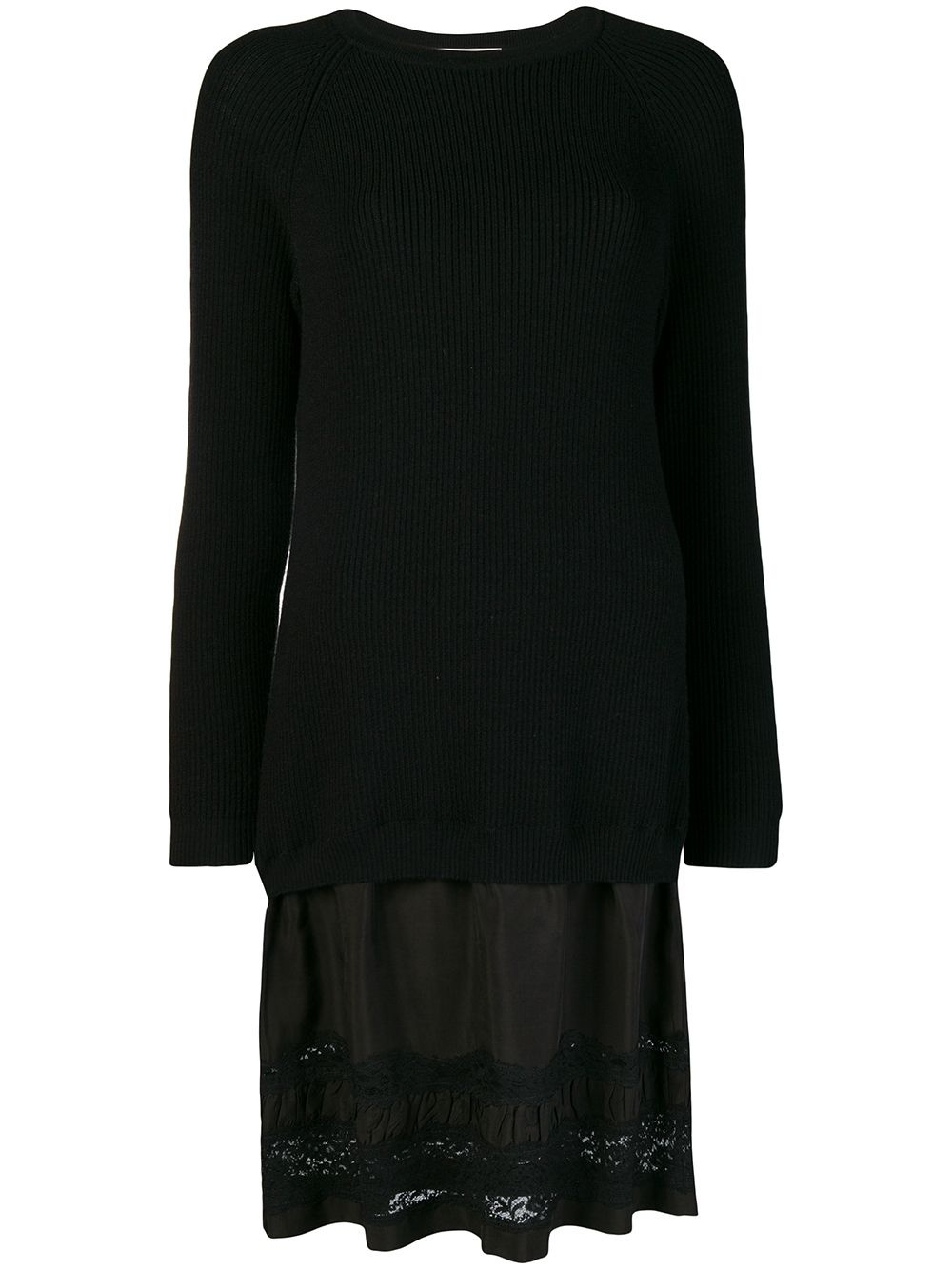 lace-panelled sweater dress Feminine yet comfortable, this dress is a lovely option for the autumn season. This black virgin wool lace-panelled sweater dress from Moschino features a round neck, long sleeves, a loose fit and a knee length. Made in Italy Composition Cupro 100%, Virgin Wool 100%, Polyamide 100% SIZE & FIT Model measurements Height 5 ft 10 in(1.78 m) Bust/Chest 27.95 in(71 cm) Hips 35.82 in(91 cm) Waist 24.01 in(61 cm) Washing instructions Dry Clean Only