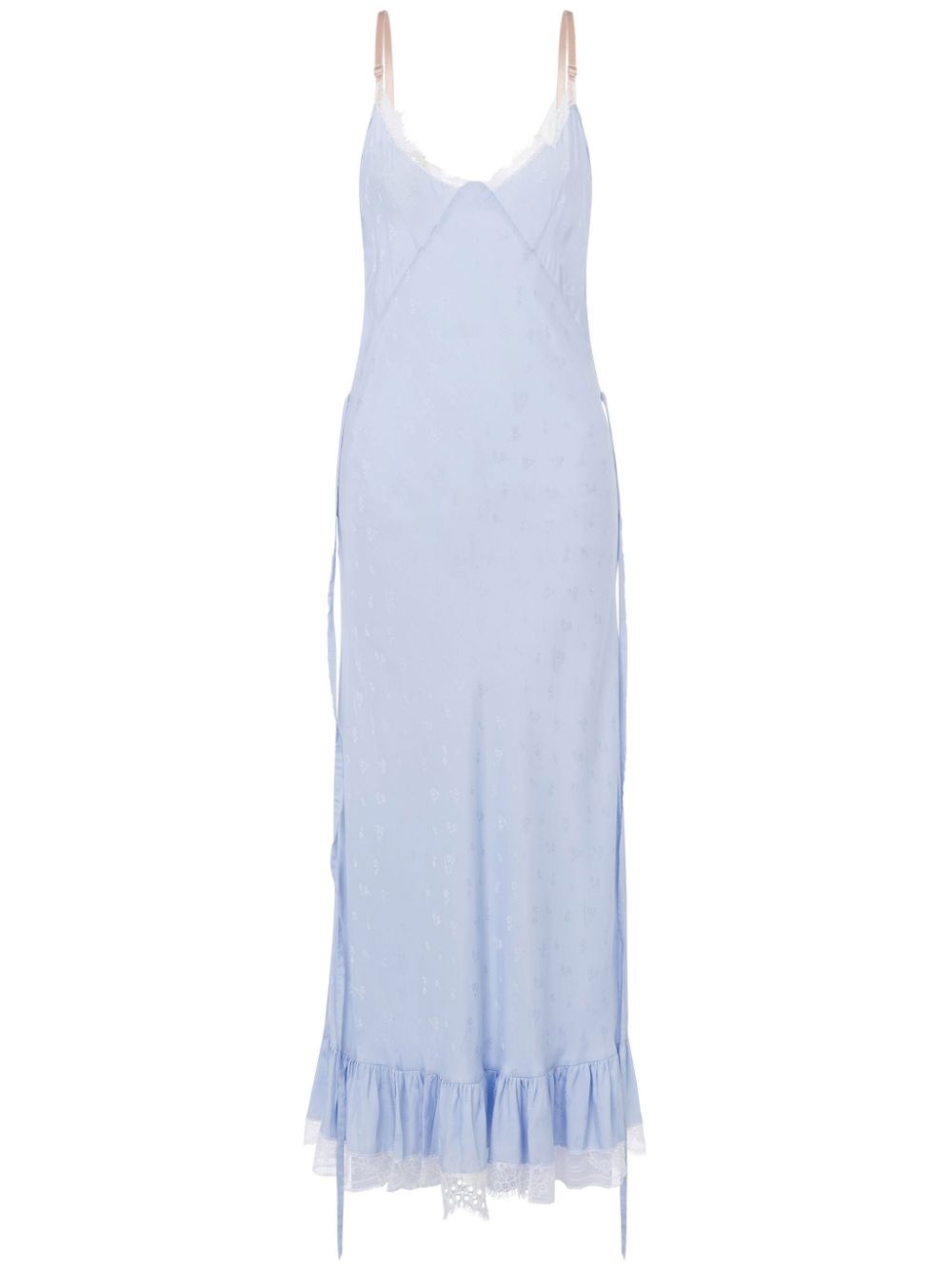 lace-trim maxi dress Highlights - Pastel blue - V-neck - Adjustable spaghetti straps - Ruffle hem Made in Italy Composition Viscose 79%, Silk 21%