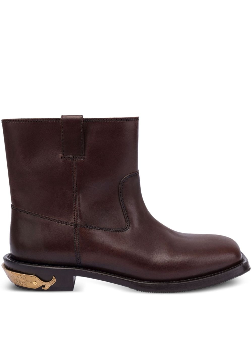 leather ankle boots Highlights - Brown - Low stacked heel - Pull-on design - Stitched detailing - Decorative rear motif Made in Italy Composition Outer: Calf Leather 100% Lining: Calf Leather 100% Sole: Rubber 100%