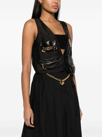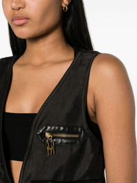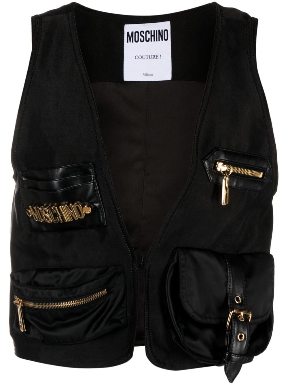 lettering logo-plaque satin gillet With faux-leather trimming, this lightweight gilet from Moschino is punctuated with gold-tone hardware. Four front pockets are enhanced with metallic detailing, whilst one of them is adorned with the brand's logo lettering. Highlights - Black - Satin finish - Faux-leather trim - Gold-tone logo lettering - V-neck - Front hook and eye fastening - Sleeveless - Slip pocket to the front - Zip-fastening chest pocket - Front zip-fastening pouch pocket - Cargo pocket to the front - Full lining - Straight hem Made in Italy Composition Outer: Polyamide 100%, Lyocell 100%, Polyester 100%, Polyurethane Resin 100% Lining: Cupro 52%, Acetate 48% SIZE & FIT Model measurements Height 5 ft 11 in(1.8 m) Bust/Chest 30.7 in(78 cm) Hips 35.03 in(89 cm) Waist 24.4 in(62 cm) FittingInformation Designed for a relaxed fit, this piece allows for comfort and movement when worn Made from a midweight non-stretch fabric This piece fits true to size – take your usual size Washing instructions Dry Clean Only