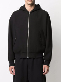 logo-applique zipped hoodie black virgin wool applique logo front zip fastening two side flap pockets classic hood long sleeves Made in Italy Composition Outer: Virgin Wool 90%, Viscose 85%, Wool 15%, Polyamide 8%, Spandex/Elastane 2% Lining: Viscose 100% SIZE & FIT Model measurements Height 6 ft 1 in(1.86 m) Bust/Chest 35.43 in(90 cm) Hips 35.43 in(90 cm) Waist 29.92 in(76 cm) FittingInformation This piece fits true to size. We recommend you get your regular size Cut for a loose fit Made with a mid-weight fabric Washing instructions Dry Clean Only