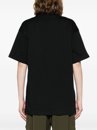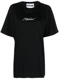 logo-embroidered cotton T-shirt Moschino’s T-shirt is rendered in black and cut from cotton jersey. It’s embroidered with a cursive logo at the front in contrasting white threads. Highlights - Black - Cotton - Jersey texture - Embroidered logo to the front - Crew neck - Drop shoulder - Short sleeves - Straight hem Imported Composition Cotton 100% SIZE & FIT Model measurements Height 5 ft 10 in(1.79 m) Bust/Chest 32.67 in(83 cm) Hips 34.25 in(87 cm) Waist 24.4 in(62 cm) FittingInformation Designed to be unstructured, offering a loose fit throughout Made from a midweight non-stretch fabric, this piece offers minimal elasticity when worn This piece fits true to size – take your usual size Washing instructions Hand Wash
