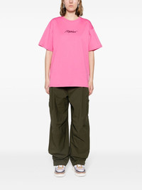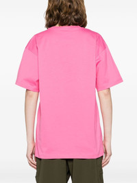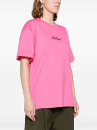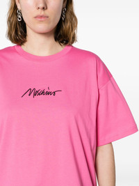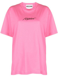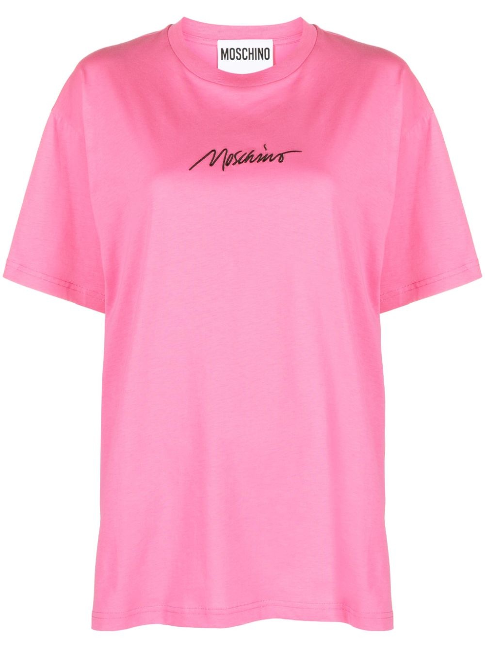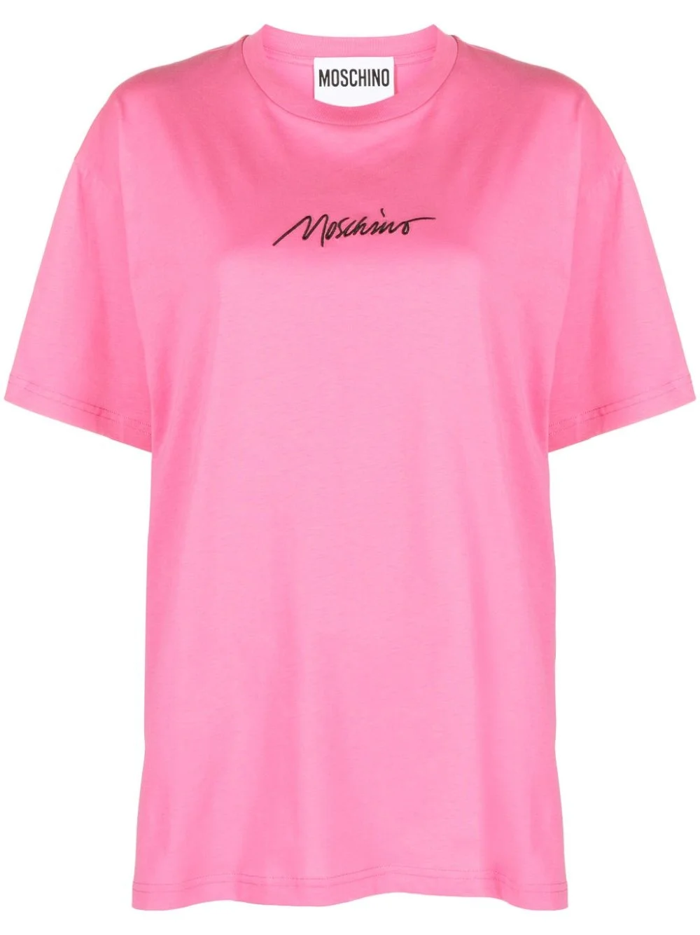 logo-embroidered cotton T-shirt Moschino’s T-shirt is rendered in pink and cut from cotton jersey. It’s embroidered with a cursive logo at the front in contrasting black threads. Highlights - Bubblegum pink - Cotton - Jersey texture - Embroidered logo to the front - Crew neck - Drop shoulder - Short sleeves - Straight hem Imported Composition Cotton 100% SIZE & FIT Model measurements Height 5 ft 10 in(1.79 m) Bust/Chest 32.67 in(83 cm) Hips 34.25 in(87 cm) Waist 24.4 in(62 cm) FittingInformation Designed to be unstructured, offering a loose fit throughout Made from a midweight non-stretch fabric, this piece offers minimal elasticity when worn This piece fits true to size – take your usual size Washing instructions Hand Wash
