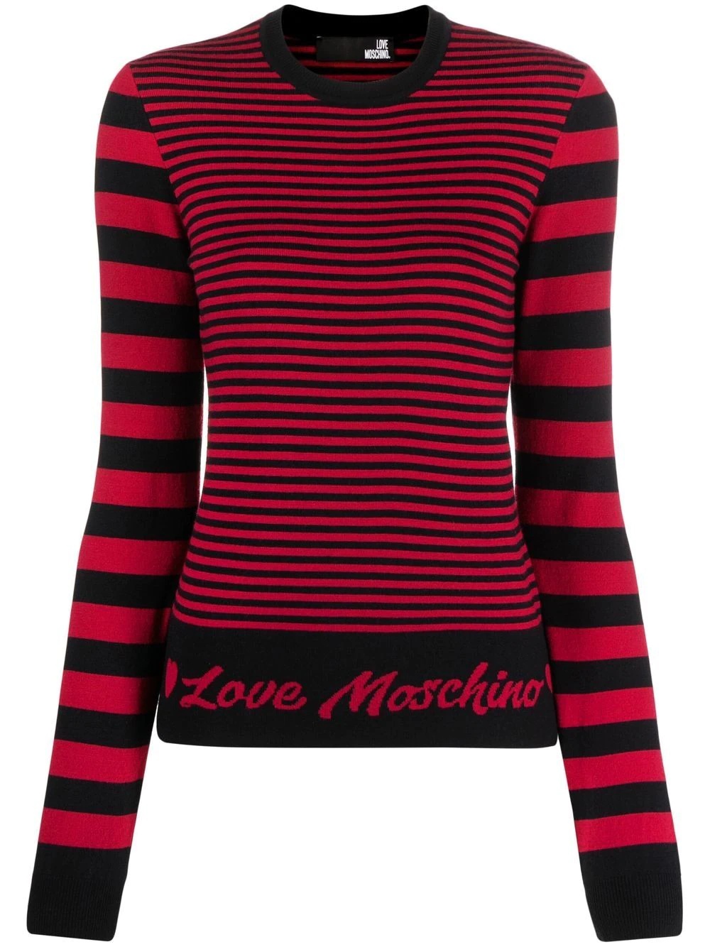 intarsia-logo striped jumper Presented in a black and red colourway, this jumper presents Love Moschino's offering for a classic striped top. The slim-fit piece is finished with an intarsia logo along the hem. Imported Composition Polyamide 38%, Acrylic 31%, Wool 20%, Polyester 11% SIZE & FIT Model measurements Height 5 ft 10 in(1.78 m) Bust/Chest 31.49 in(80 cm) Hips 35.43 in(90 cm) Waist 24.4 in(62 cm) FittingInformation This piece fits true to size. We recommend you get your regular size Cut for a relaxed fit Made with a mid-weight fabric Washing instructions Dry Clean Only