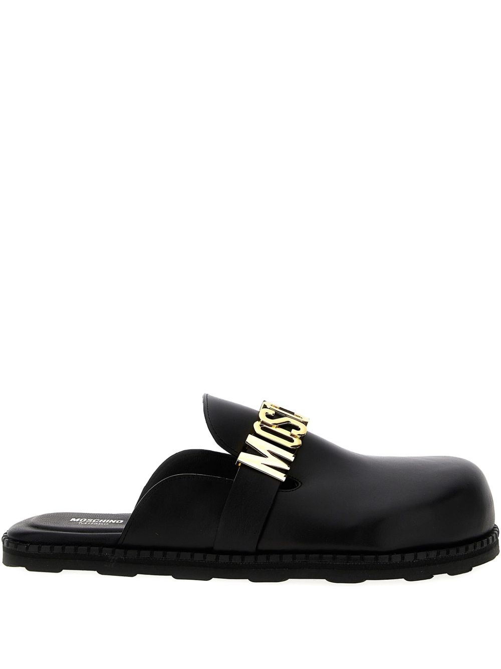logo-plaque leather mules Highlights - Black - Leather upper - Gold-tone logo plaque - Rubber sole - Slip-on style - Textured flat sole Imported Composition Sole: Rubber 100% Lining: Viscose 100% Outer: Leather 100%