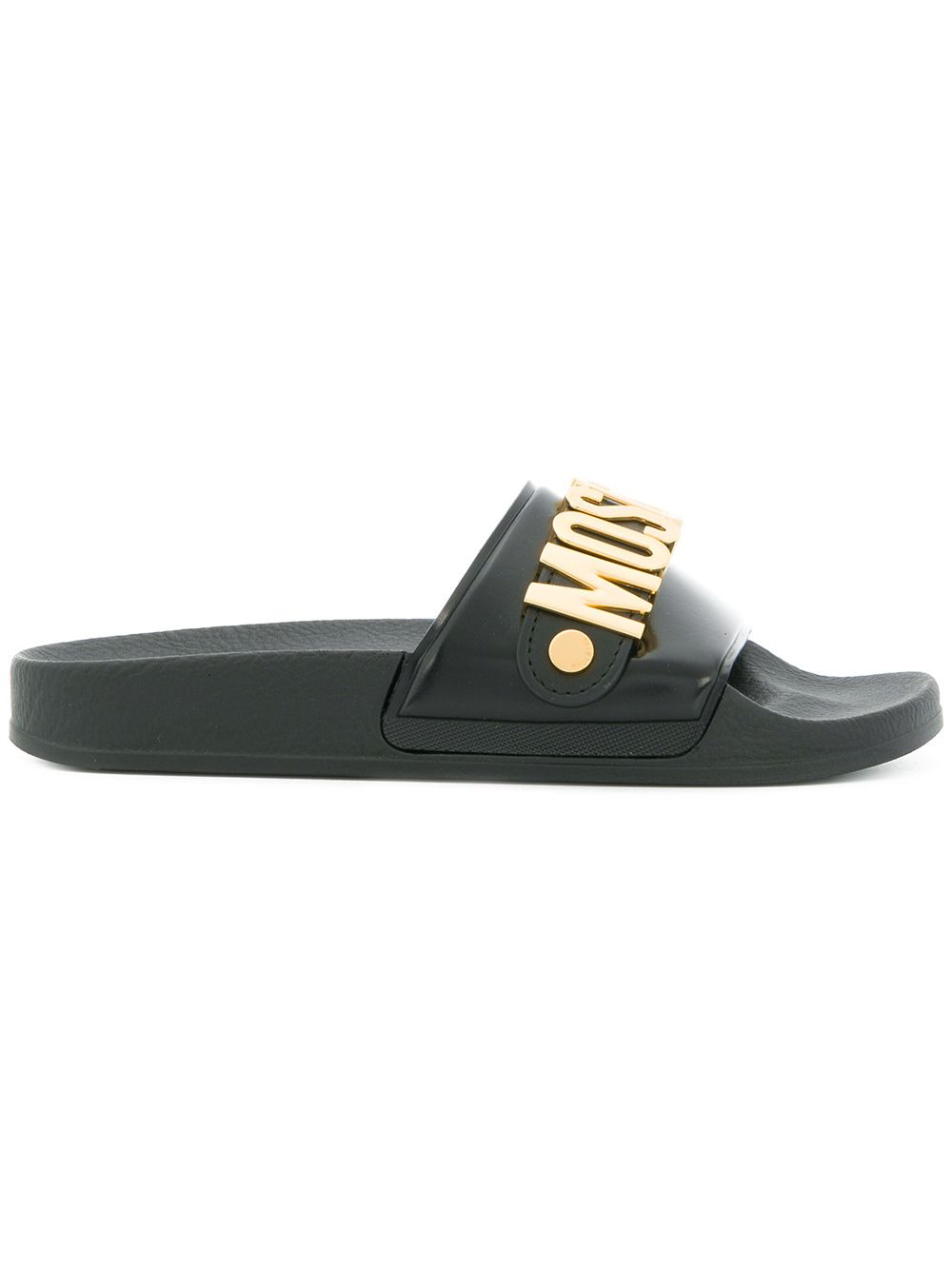 logo plaque pool slides Jeremy Scott creates punchy designs under the house of Moschino. Expect to see colour blocked designs, pop culture motifs and bold brand logos. Comfortable yet stylish, these black rubber logo plaque pool slides rocks an open toe, a moulded footbed and gold-toned hardware Made in Italy Composition Sole: Rubber 100% Lining: PVC 100% Outer: PVC 100% SIZE & FIT Measurement Sole height 0.39 in(1 cm) HEEL 0.78 in(2 cm)