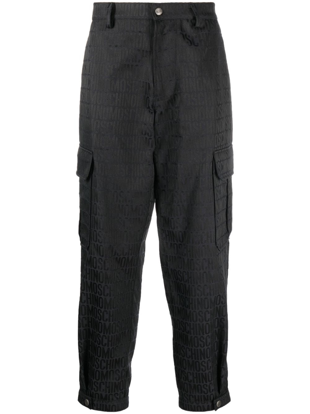 logo-print cargo trousers Imagined in a sleek tonal design, these straight trousers from Moschino are adorned all-over with the brand's signature logo. The multiple cargo pockets highlight an utilitarian inspiration for AW23. Highlights - Black - All-over logo print - High waist - Multiple cargo pockets - Front button and zip fastening - Belt loops - Straight leg Made in Italy Composition Polyester 59%, Cotton 41% SIZE & FIT Model measurements Height 6 ft 2 in(1.87 m) Bust/Chest 35.82 in(91 cm) Hips 35.43 in(90 cm) Waist 27.95 in(71 cm) FittingInformation Designed for a tapered leg, offering a loose unrestricted fit over the leg with a closer fit towards the ankle The adjustable tabs allow for fitted preferences Made from a midweight non-stretch fabric This piece fits true to size – take your usual size