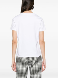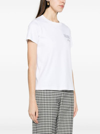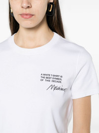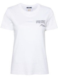 logo-print organic cotton T-shirt Cut from soft organic cotton, this classic white T-shirt by Moschino is designed for a slim fit. It's defined by a contrasting all-caps slogan and cursive logo script at the chest. Highlights - White - Organic cotton - Jersey texture - Text and logo print at the chest - Crew neck - Short sleeves - Straight hem Imported Composition Organic Cotton 100% SIZE & FIT Model measurements Height 5 ft 11 in(1.8 m) Bust/Chest 31.49 in(80 cm) Hips 36.22 in(92 cm) Waist 25.59 in(65 cm) FittingInformation Designed for a slim fit that sits just away from the body offering a close yet comfortable fit Made from a midweight non-stretch fabric, this piece offers minimal elasticity when worn This piece fits true to size – take your usual size Washing instructions Hand Wash