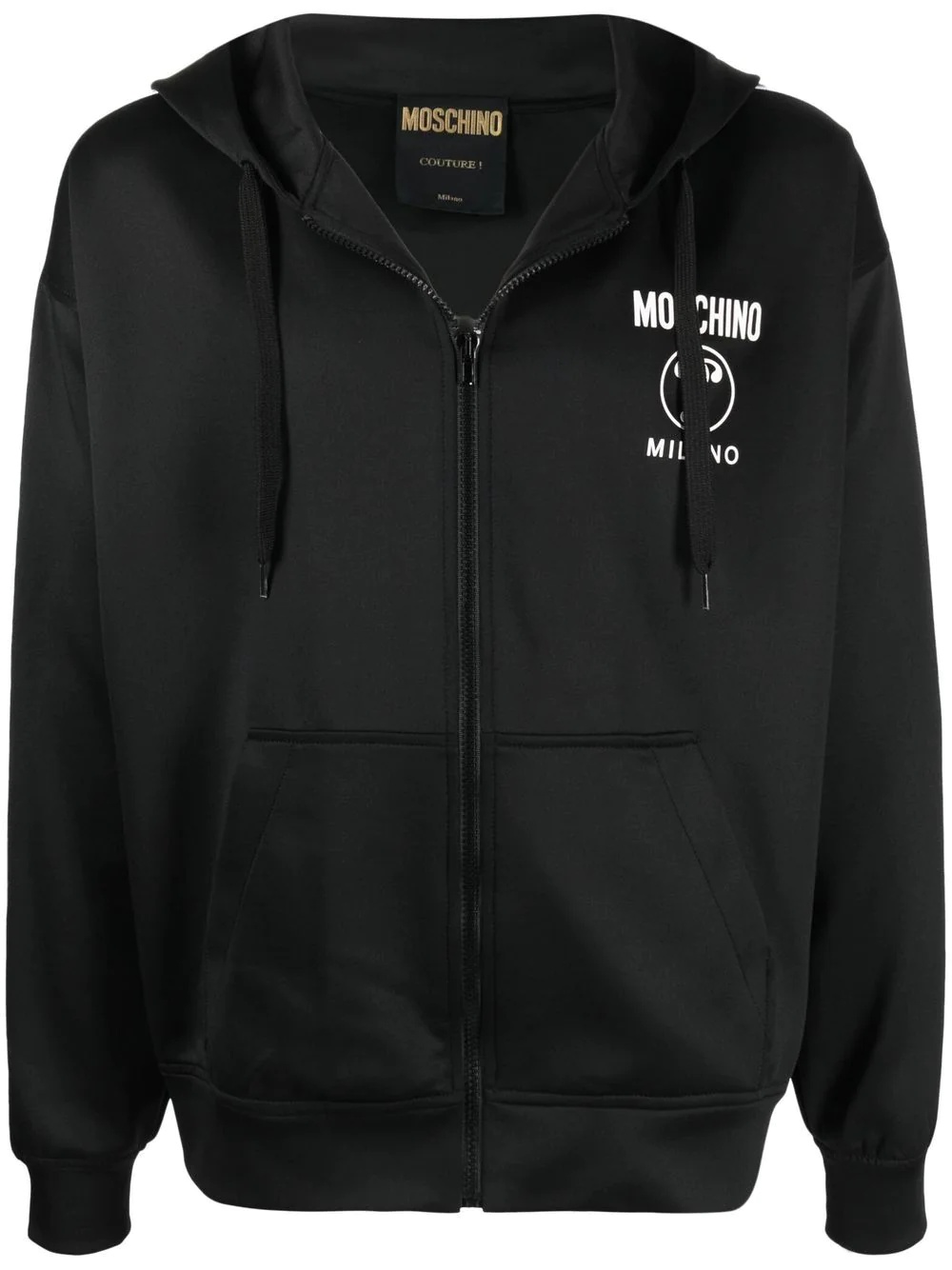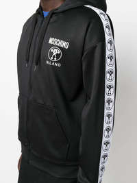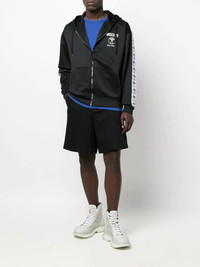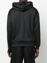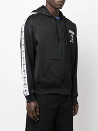 logo-print zip-up hoodie black logo print at the chest logo-tape detailing drawstring hood front zip fastening long sleeves two side pouch pockets straight hem Made in Italy Composition Polyester 90%, Elastane 10% SIZE & FIT Model measurements Height 6 ft 0 in(1.84 m) Bust/Chest 35.82 in(91 cm) Hips 37 in(94 cm) Waist 28.34 in(72 cm)