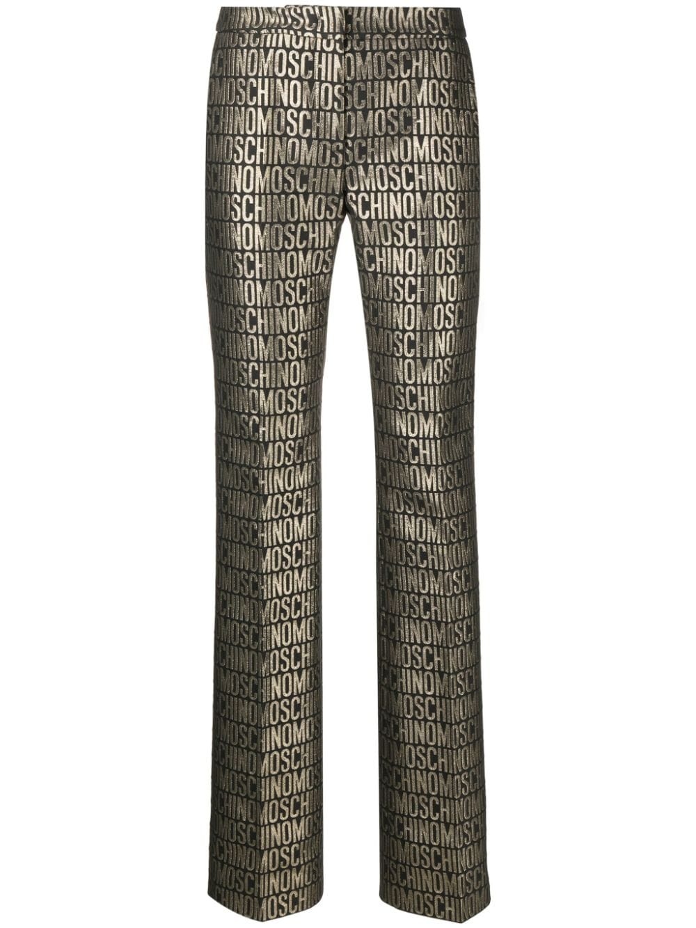 metallic logo-print straight-leg trousers Highlights - Black/gold-tone - Cotton blend - Metallic effect - All-over logo print - Concealed front fastening - Rear welt pocket - Straight leg Made in Italy Composition Outer: Polyester 56%, Cotton 38%, Metal 3%, Polyamide 3% Lining: Acetate 60%, Cupro 40% SIZE & FIT Model measurements Height 5 ft 10 in(1.78 m) Bust/Chest 31.49 in(80 cm) Hips 35.03 in(89 cm) Waist 23.62 in(60 cm) FittingInformation Designed for a straight-leg fit, these trousers allow for a close fit at the waist and an unrestricted, comfortable fit over the leg Made from a midweight non-stretch fabric This piece fits true to size – take your usual size Washing instructions Dry Clean Only