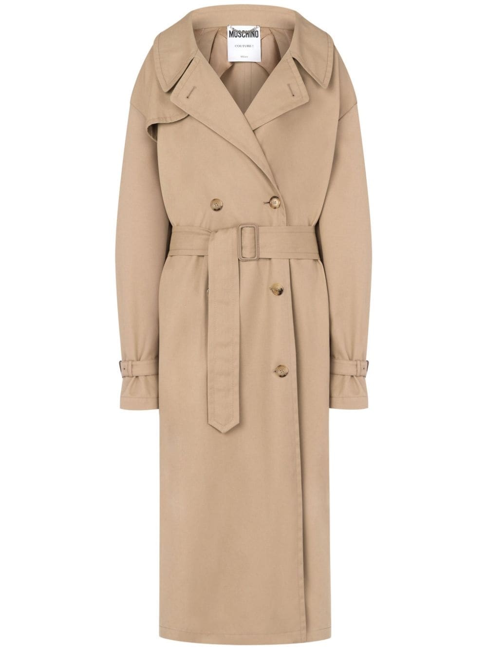 notched-lapel trench coat Highlights - Sand beige - Notched lapels - Double-breasted button fastening - Belted waist - Two side welt pockets - Long sleeves - Straight hem - Mid-length Made in Italy Composition Polyester 65%, Cotton 35%