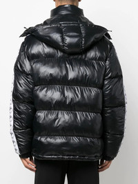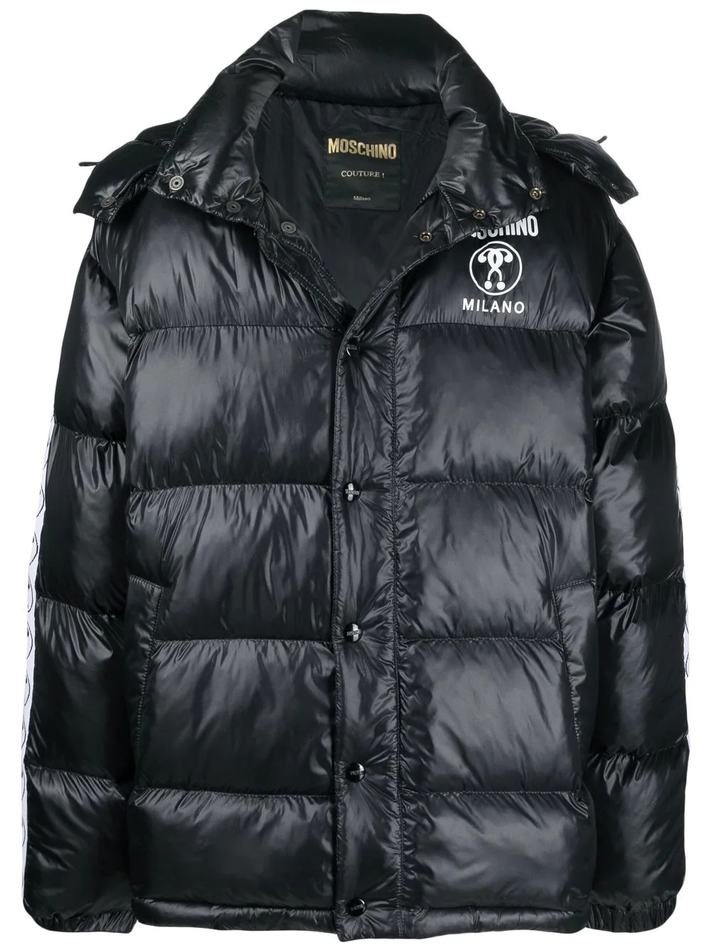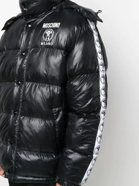 padded hooded coat Moschino's graphic branding decorates this hooded padded jacket, laid in contrast at the chest and on the sleeves, emphasising the bold aesthetic of the plush, high-shine design. Highlights - Black/white - Padded design - Logo print at the chest - Logo-tape detailing - High neck - Classic hood - Front button fastening - Long sleeves - Straight hem Made in Italy Composition Outer: Polyamide 100% Lining: Polyester 100% SIZE & FIT Model measurements Height 6 ft 2 in(1.88 m) Bust/Chest 36.61 in(93 cm) Hips 35.82 in(91 cm) Waist 27.95 in(71 cm) FittingInformation This piece fits true to size. We recommend you get your regular size Cut for an oversized fit Made with a lightweight non-stretch fabric Washing instructions Hand Wash