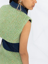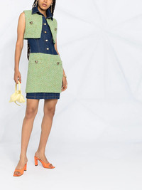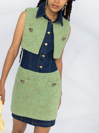 panelled fitted dress If you can't make your mind up between casual denim and ladylike tweed, this is the dress for you. Moschino's layered dress makes a perfect choice for indecisive days. Get the best of both. Highlights - Blue/green - Virgin wool-blend/denim - Panelled design - Fitted silhouette - Gold-tone hardware - Classic collar - Front button fastening - Sleeveless - Two chest patch pockets - Two front welt pockets Made in Italy Composition Outer: Virgin Wool 53%, Cotton 38%, Polyester 7%, Acrylic 2% Lining: Cupro 94%, Spandex/Elastane 6% SIZE & FIT Model measurements Height 5 ft 10 in(1.78 m) Bust/Chest 30.31 in(77 cm) Hips 36.61 in(93 cm) Waist 24.8 in(63 cm) Washing instructions Dry Clean Only