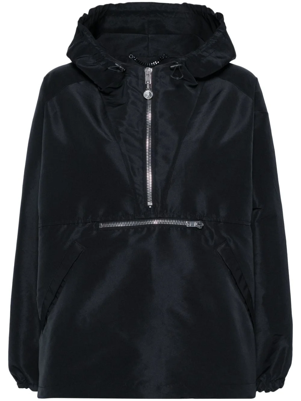 patch-detail hooded jacket Highlights - Black - Shell - Patch detail at the sleeve - Drawstring hood - Long sleeves - Elasticated cuffs - Front zip-fastening pocket - Front pouch pocket - Drawstring straight hem - Short front zip fastening Made in Italy Composition Lining: Polyamide 58%, Polyester 42% Outer: Polyester 100% SIZE & FIT Model measurements Height 5 ft 11 in(1.8 m) Bust/Chest 30.7 in(78 cm) Hips 35.03 in(89 cm) Waist 24.4 in(62 cm) FittingInformation Designed for a boxy fit, intended for a loose fit throughout The internal drawstring at the hem allows for fitted preferences Made from a midweight non-stretch fabric This piece fits true to size – take your usual size Washing instructions Dry Clean Only
