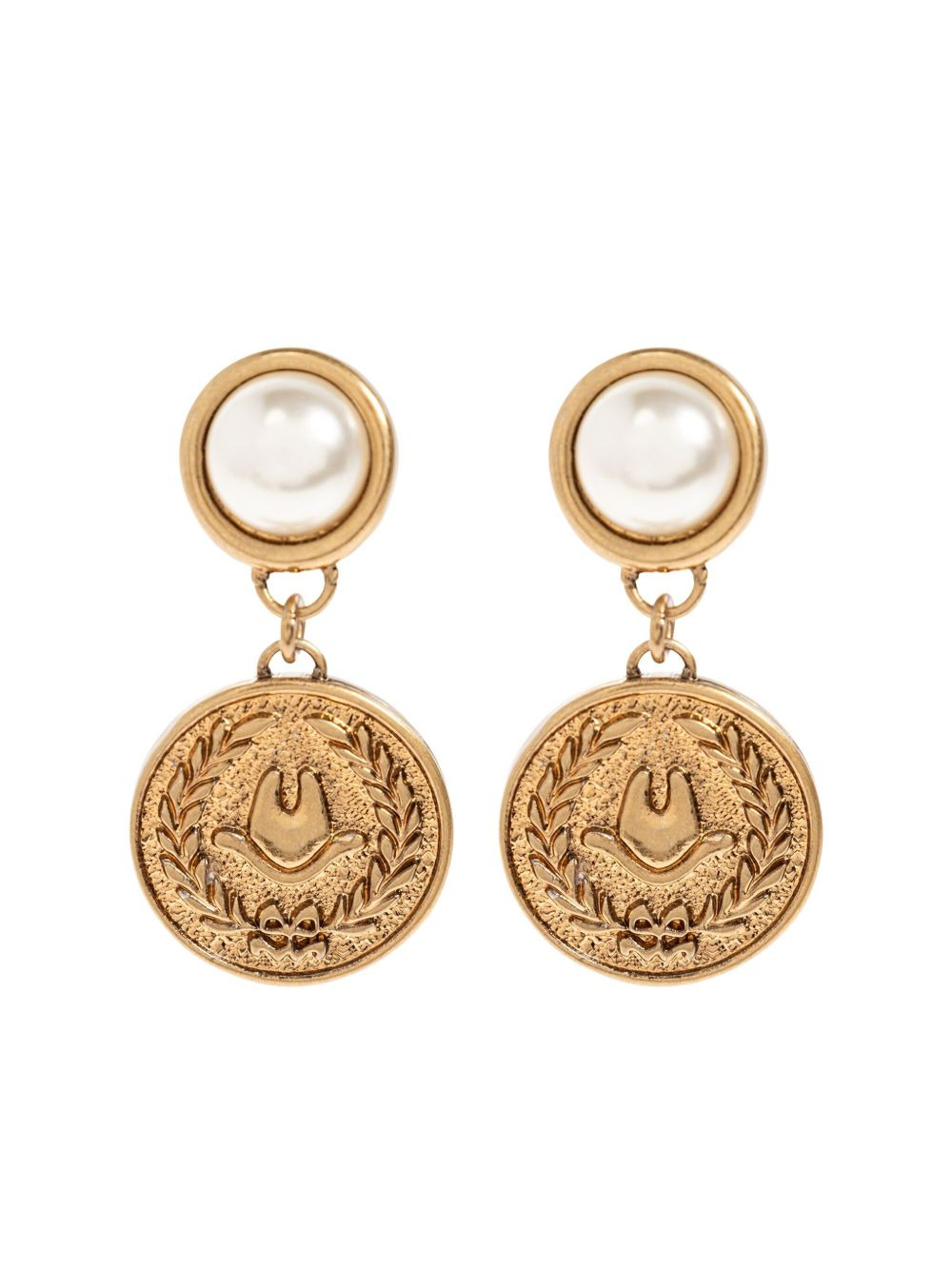 pearl-embellished coin earrings Highlights - Gold-tone - Faux-pearl embellishment - Coin-shaped pendant - Embossed detail - Post fastening - These earrings come as a pair. Made in Italy