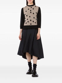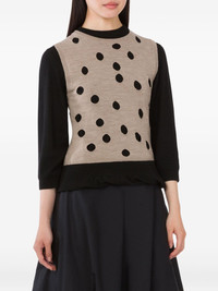 polka-dot ruffled sweater Highlights - Black and beige - Polka dot pattern - Three-quarter sleeves - Round neck - Ruffled hem Made in Italy Composition Wool 36%, Polyamide 32%, Viscose 27%, Cashmere 5% Washing instructions Dry Clean Only