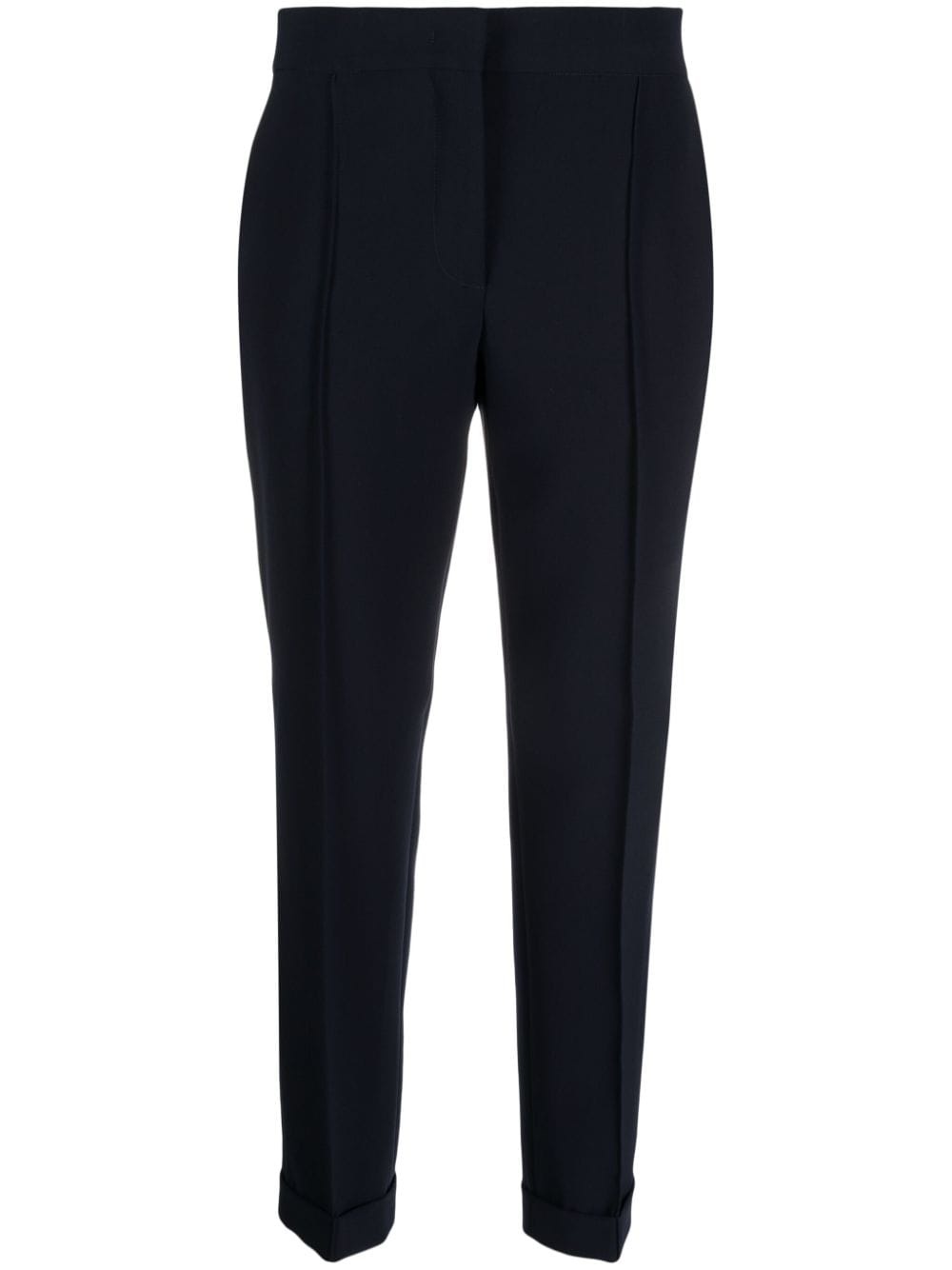 pressed-crease concealed-fastening tapered trousers Highlights - Navy blue - Stretch-design - Pressed crease - Concealed front fastening - Turn-up brim - Tapered leg Made in Italy Composition Outer: Polyester 88%, Elastane 12% Lining: Acetate 60%, Cupro 40% SIZE & FIT Model measurements Height 5 ft 10 in(1.77 m) Bust/Chest 32.28 in(82 cm) Hips 35.03 in(89 cm) Waist 25.19 in(64 cm) FittingInformation Designed for a slim fit, these trousers offer a close fit at the waist, allowing a comfortable close fit and some movement over the leg Made from a midweight stretch fabric, this piece offers elasticity and flexibility when worn This piece fits true to size – take your usual size Washing instructions Dry Clean Only