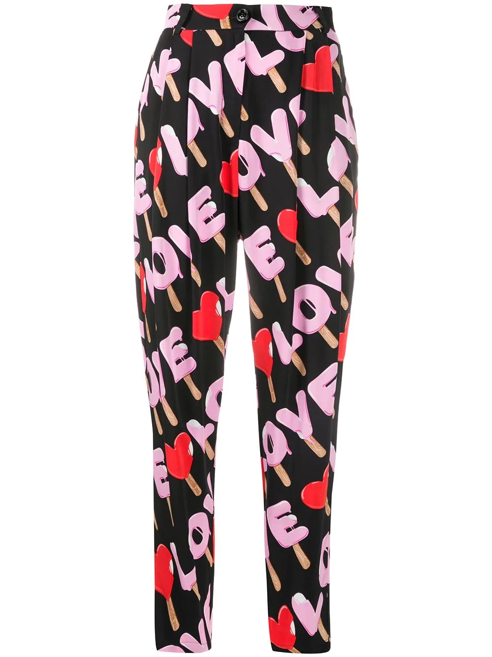 printed tailored trousers Black, red and pink printed tailored trousers from Love Moschino featuring a high waist, a waistband with belt loops, side seam pockets, a top button, a concealed fastening and a straight hem. Imported Composition Viscose 100% SIZE & FIT Model measurements Height 5 ft 9 in(1.75 m) Bust/Chest 32.67 in(83 cm) Hips 36.22 in(92 cm) Waist 24.8 in(63 cm) FittingInformation This piece fits true to size. We recommend you get your regular size Designed to be fitted at the waist and hips, loose over the leg Made with a lightweight non-stretch fabric Washing instructions Dry Clean Only