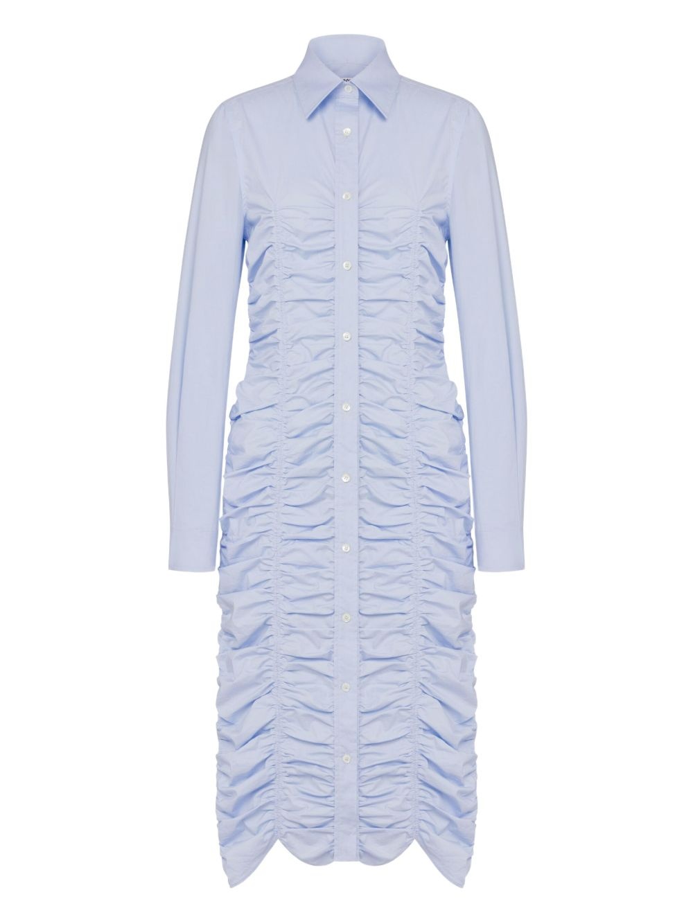 ruched button-down midi dress Highlights - Light blue - Front button fastening - Ruched detailing - Long sleeves - Pointed collar Imported Composition Cotton 94%, Elastane 6% SIZE & FIT FittingInformation Designed for a slim fit that sits just away from the body offering a close yet comfortable fit Made from a midweight stretch fabric, this piece offers elasticity and flexibility when worn Washing instructions Dry Clean Only