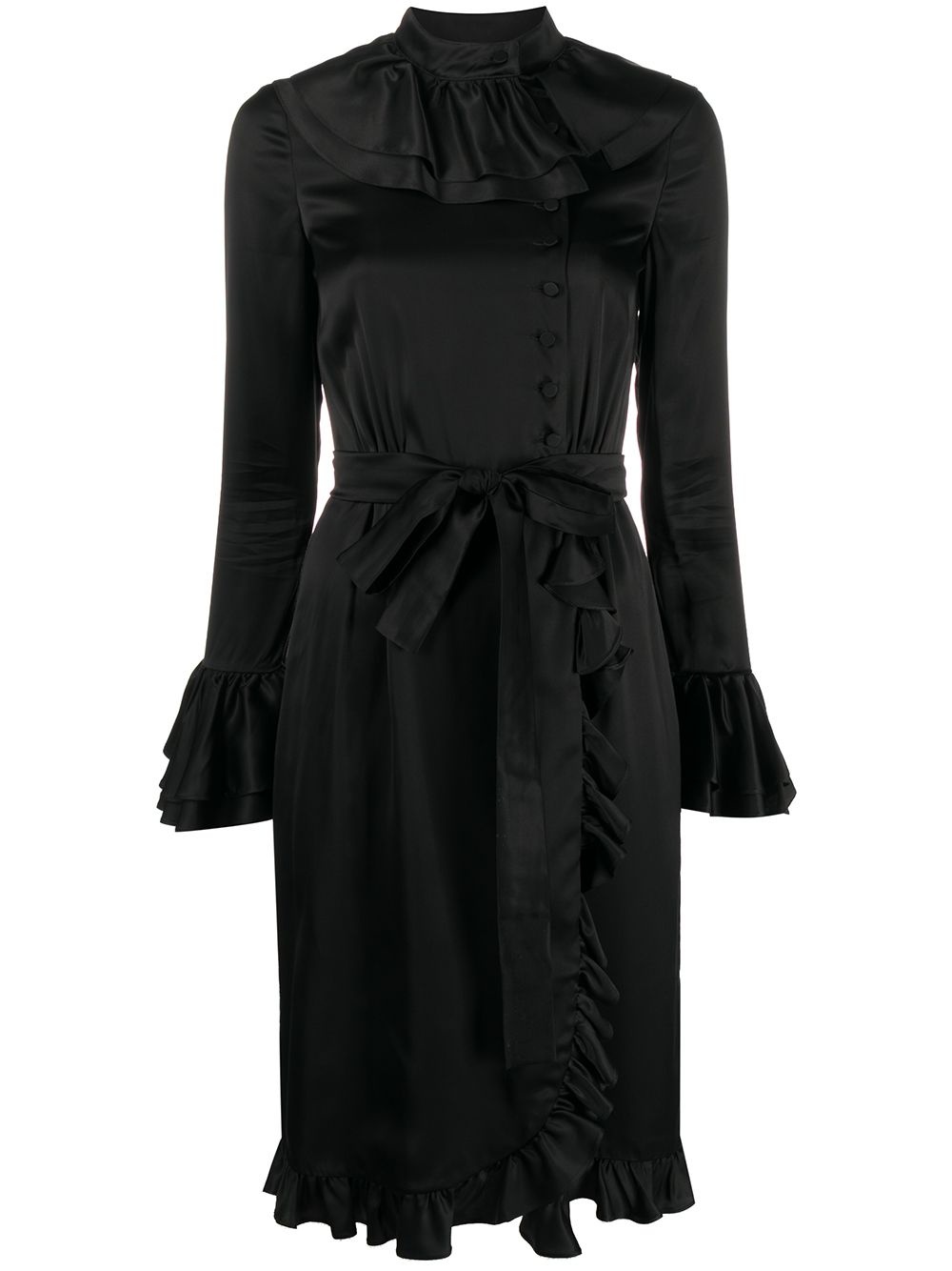 ruffled wrap dress It's a wrap, your search for the perfect versatile dress has met its end. This ruffled wrap dress from Moschino ticks all the boxes and can be dressed up or down. You'll want to show it off on the regular. Made in Italy Composition Viscose 72%, Silk 14%, Modal 14% SIZE & FIT Model measurements Height 5 ft 10 in(1.78 m) Bust/Chest 31.49 in(80 cm) Hips 36.22 in(92 cm) Waist 25.59 in(65 cm) FittingInformation This piece fits true to size. We recommend you get your regular size Designed for a close fit at the bust and waist, but loose at the hip Made with a mid-weight non-stretch fabric Washing instructions Dry Clean Only