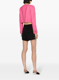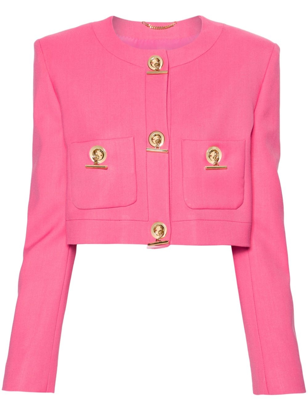 single-breasted cropped blazer Highlights - Fuchsia pink - Twill weave - Metal eyelet detailing - Round neck - Front t-bar fastening - Shoulder pads - Long sleeves - T-bar fastening cuffs - Two chest patch pockets - Cropped - Straight hem - Gold-tone hardware Made in Italy Composition Outer: Viscose 80%, Virgin Wool 18%, Spandex/Elastane 2% Lining: Acetate 83%, Silk 17% SIZE & FIT Model measurements Height 5 ft 10 in(1.78 m) Bust/Chest 29.92 in(76 cm) Hips 34.64 in(88 cm) Waist 23.62 in(60 cm) FittingInformation Designed to be unstructured, offering a loose fit throughout The internal shoulder pads offer a structured shape Made from a midweight fabric This piece fits true to size – take your usual size