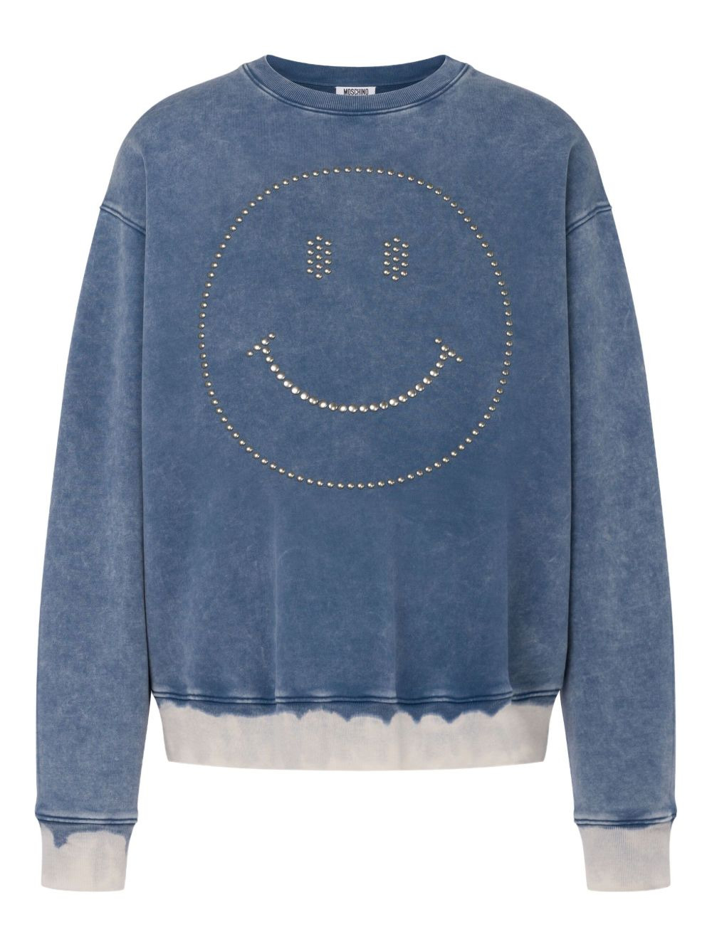 smiley face-studded sweatshirt Highlights - Blue - Studded smiley face design - Ribbed crew neck - Dropped shoulders - Contrast hem Imported Composition Cotton 100% Washing instructions Hand Wash