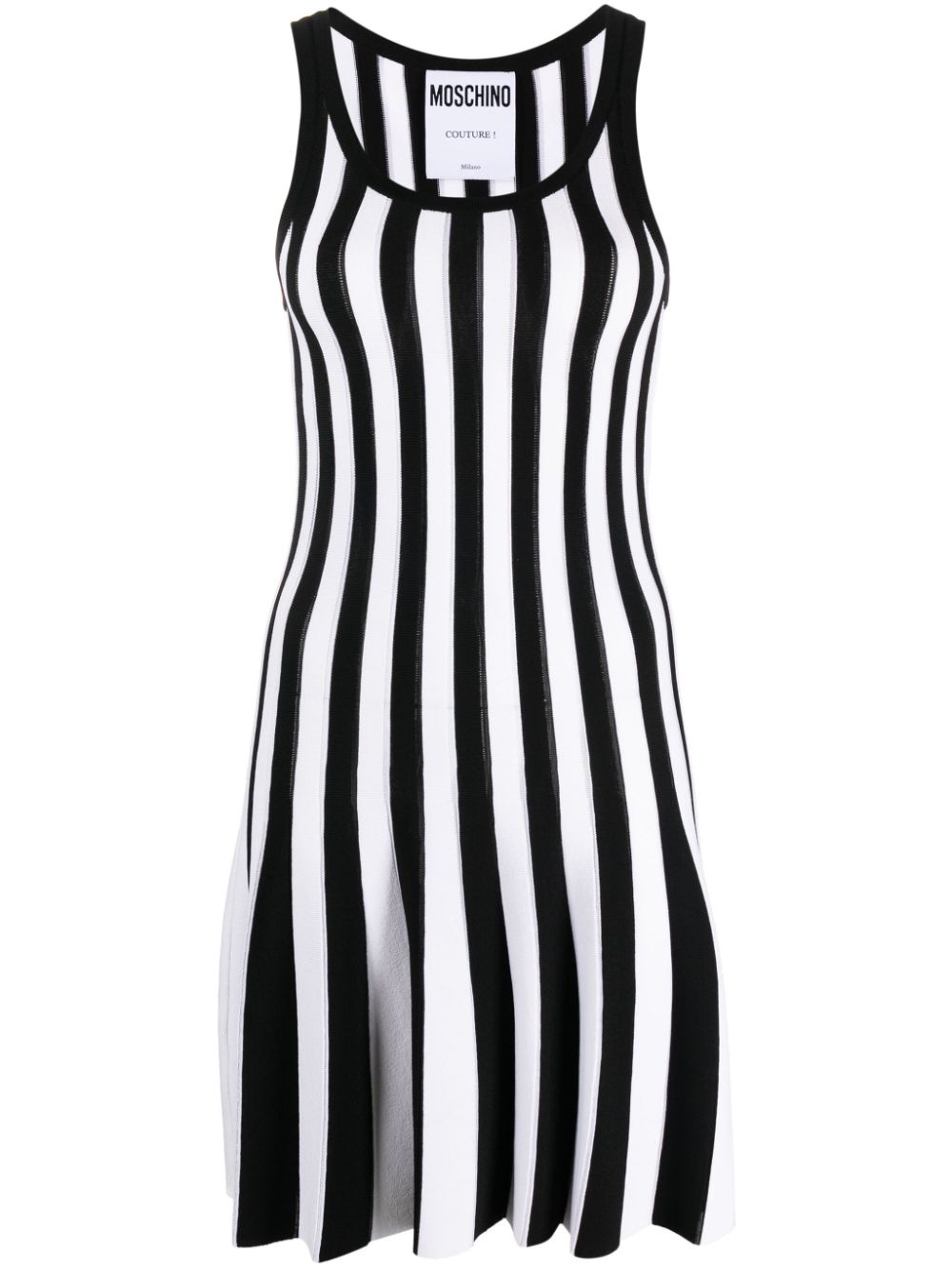 striped ribbed-knit minidress Highlights - Black/white - Ribbed knit - Vertical stripe pattern - Scoop neck - Sleeveless - Flared hem - Above-knee length - Unlined Imported Composition Viscose 88%, Polyester 12% SIZE & FIT Model measurements Height 5 ft 9 in(1.76 m) Bust/Chest 31.88 in(81 cm) Hips 35.43 in(90 cm) Waist 24.8 in(63 cm) FittingInformation Designed for a close fit at the chest and waist with a loose fit at the hip Made with a midweight knit, this piece offers some stretch This piece fits true to size – take your usual size Washing instructions Dry Clean Only