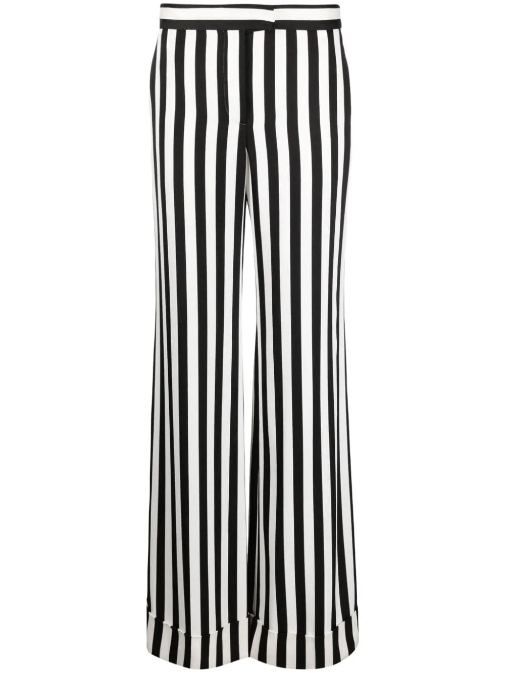striped satin palazzo pants Highlights - White/black - Satin finish - Vertical stripe print - Wide leg - Mid-rise - Concealed front button, hook and zip fastening - Two diagonal pockets to the sides - Two rear welt pockets - Turn-up hem Made in Italy Composition Lining: Cupro 100%, Acetate 60% Outer: Viscose 100% Washing instructions Dry Clean Only