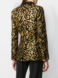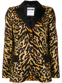Tiger sequin-embellished blazer The flamboyant Moschino mode continues to be the perfect combination of pop culture humour and high-end Italian construction, as showcased by this yellow and black silk blend and cotton Tiger poplin blazer. Highlights - Yellow/black - Silk-blend/cotton - Signature tiger sequinned pattern - Peaked lapels - Front button fastening - Long sleeves - Front pockets Made in Italy Composition Outer: Cotton 100%, Silk 70%, PVC 60%, Polyester 30%, glass 25%, Acrylic 15% Lining: Acetate 51%, Viscose 49% SIZE & FIT Model measurements Height 5 ft 10 in(1.78 m) Bust/Chest 33.07 in(84 cm) Hips 35.82 in(91 cm) Waist 26.96 in(68.5 cm)